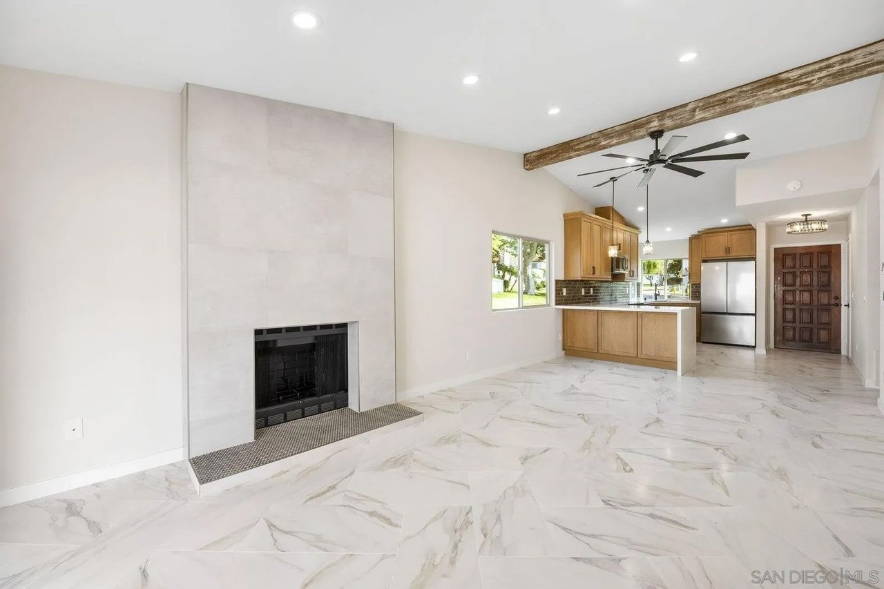 Complete house remodel from slab to ceilings, featuring a completely new kitchen, water heater replacement, new lighting, fans, flooring, and modern bathrooms, enhancing aesthetics and functionality without structural changes or major plumbing.